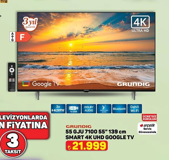 A101 20 Kasım 2025 Televizyon Kataloğu içerisinde yer alan Grundig 55 GUJ 7100 – 55” Smart 4K Google TV fiyatı 21.999 TL’dir. Google TV dünyasına giriş yapmak isteyenler için kaliteli bir seçenek oluşturuyor.