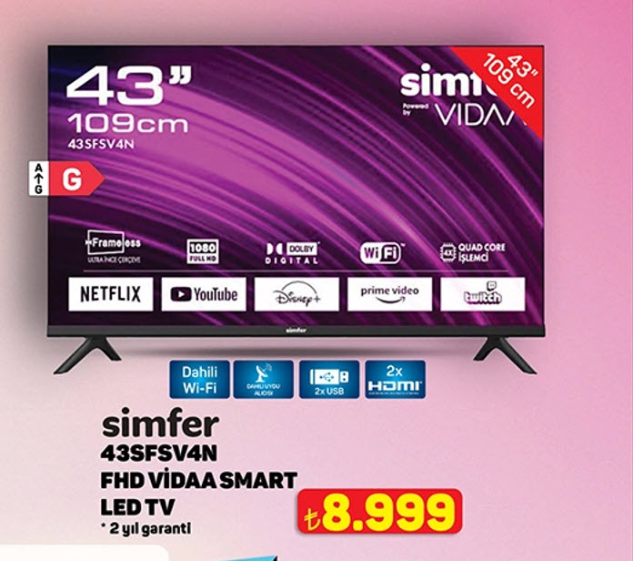 A101 Simfer 43SFSV4N FHD VİDAA SMART LED TV Özellikleri ve Fiyatı şu şekildedir.