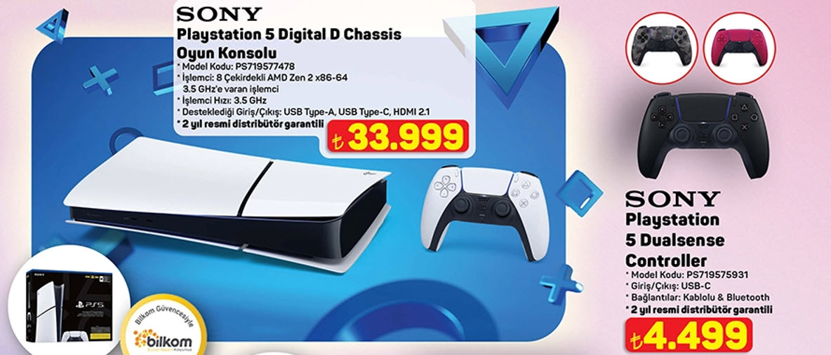 A101 25 Eylül 2025 Teknoloji Kataloğu içersinde yer alan Sony Plasystation 5 Digital D Chassis oyun konsolunun fiyatı 33.999 TL’dir. PS719577478 model kodu, 8 çekirdekli AMD Zen 2 x86 – 64 bit işlemci, 3.5 GHz işlemci, destekleyici giriş/çıkış: USB Type – A, USB Type – C, HDMI 2.1 özelliklerine sahiptir. Sony Playstation 5 Dualsense Contoller A101 alışveriş marketlerinde 4.499 TL’den satışa sunulacaktır.