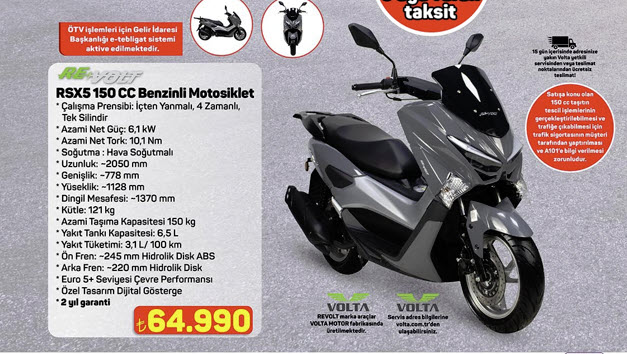 A101, her hafta düzenlediği Aldın Aldın kampanyaları ile yalnızca televizyon ve elektronik ürünlerde değil, ulaşım ve mobilite alanında da büyük fırsatlar sunmaya devam ediyor. A101 9 Ekim 2025 Perşembe günü başlayacak yeni kampanyada, Revolt markalı Volta üretimi benzinli motosiklet modelleri oldukça cazip fiyatlarla satışta olacak. Şehir içi ulaşımı kolaylaştıran bu modeller, hem ekonomik yakıt tüketimi hem de modern tasarımlarıyla dikkat çekiyor.