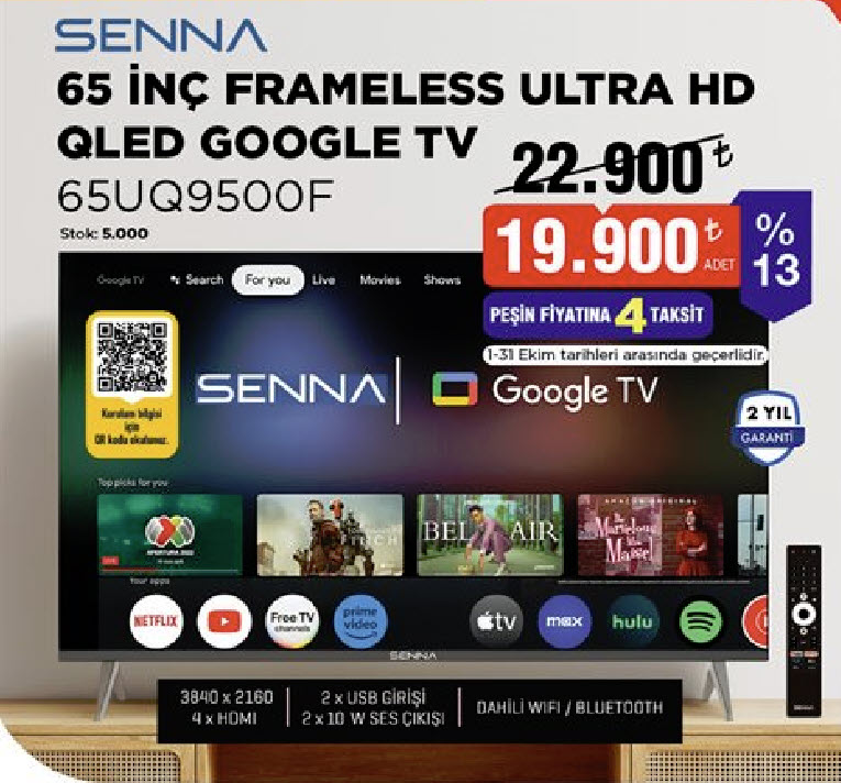 Enerji verimliliği yüksek olan SENNA 65UQ9500F, 2 yıl garantiyle birlikte satışa sunuluyor.