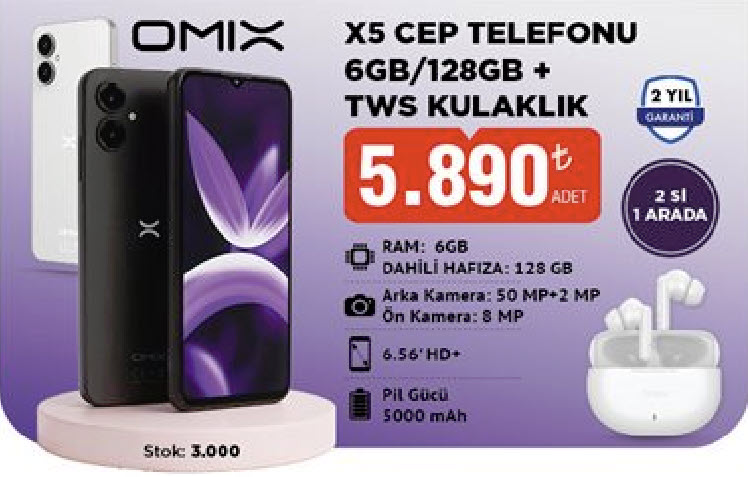OMIX X5 Cep Telefonu (6 GB RAM + 128 GB Hafıza) + TWS Kablosuz Kulaklık – 5.890 TL