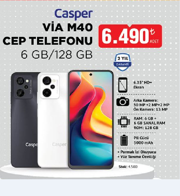 Bim 28 Kasım 2025 kataloğunda televizyonun yanında göze çarpan ikinci teknoloji ürünü ise Casper VIA M40 cep telefonu. Fiyatına göre sunduğu performans, ekran özellikleri, kameraları ve depolama kapasitesi ile dikkat çekiyor. Uygun fiyatlı bir Android telefon arayanlar için oldukça cazip bir seçenek.